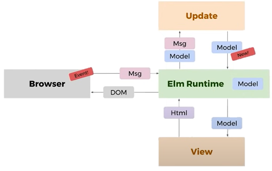 update-funktionen. Sammen med beskeden sender Elm Runtime den nuværende model, såupdate-funktionen både ved, hvad der er sket i browseren (beskeden) og hvordan hjemmesiden ser ud lige nu (modellen).update-funktionen outputter en ny model baseret på den besked den har fået. Denne nye model bliver sendt tilbage til Elm Runtime. - Herefter sender Elm Runtime den nye model til